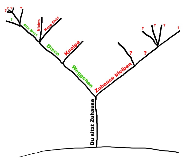 Da du dich für “Weggehen” entschieden hast, gabelt sich der Ast “Weggehen” in zwei weitere Äste:
